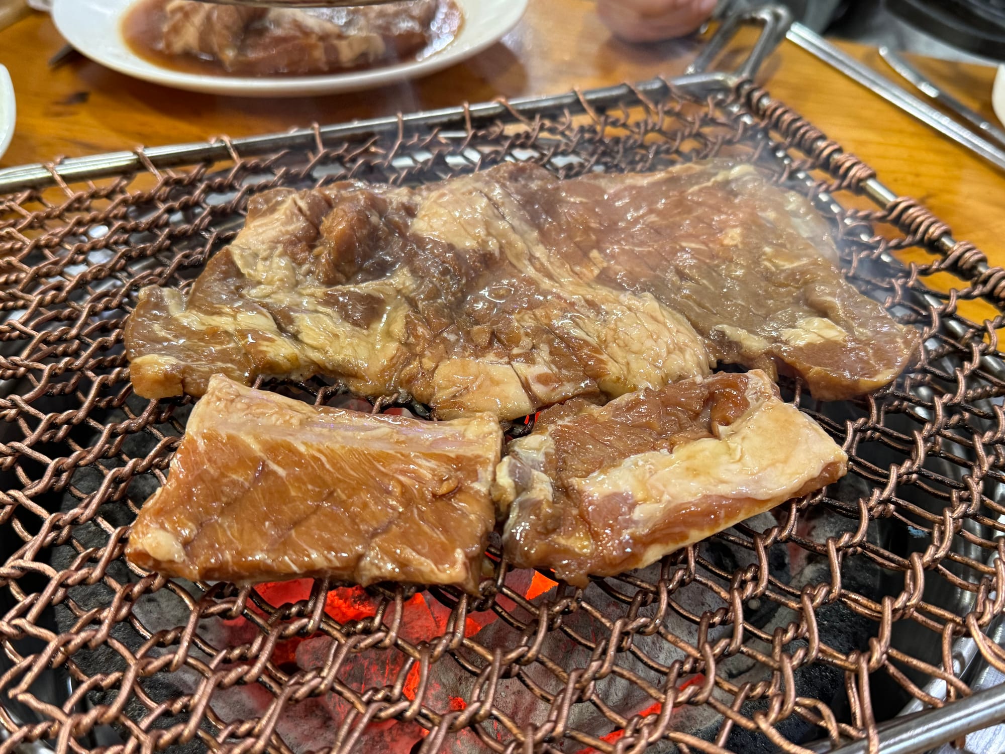 The main course was Dwaeji-galbi(돼지갈비). While the taste was ordinary, it was still a satisfying meal. An interesting way to enjoy it was grilling the Dwaeji-galbi(돼지갈비) along with Doraji-muchim(도라지무침) on the same plate. The smoky aroma of the charcoal infused into the meat made it a classic Korean BBQ experience.