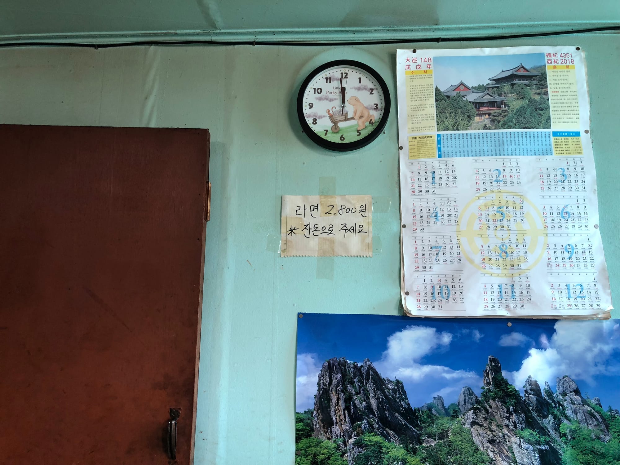 The old walls were filled with traces of the past. A small sign requested exact change of 2,800 KRW for the Ramyeon(라면), alongside an old calendar and a clock. Looking at these items makes me long to travel back to that moment and taste that special meal once more. The simplicity of the space reflected the honest and generous heart of the grandmother.