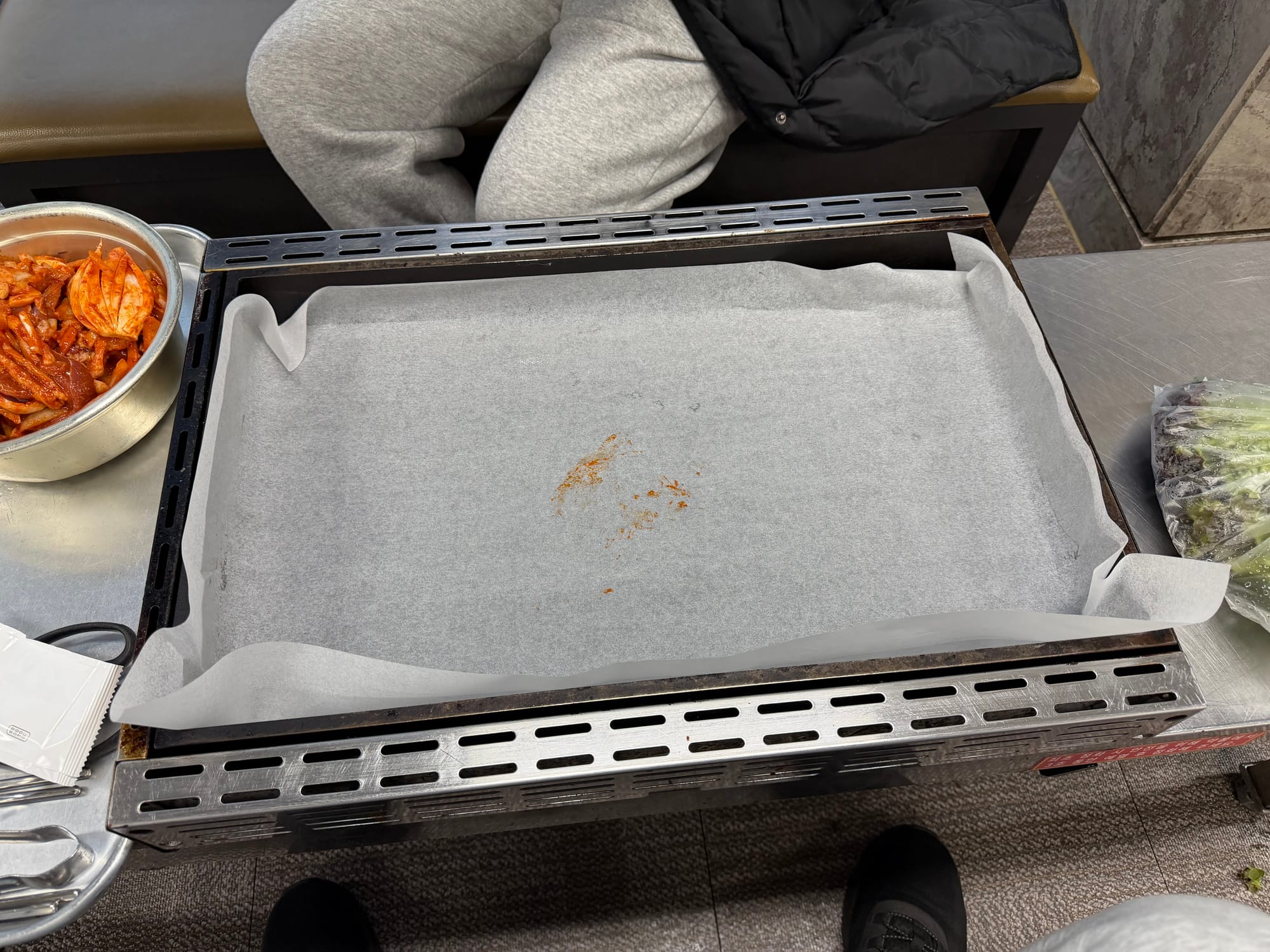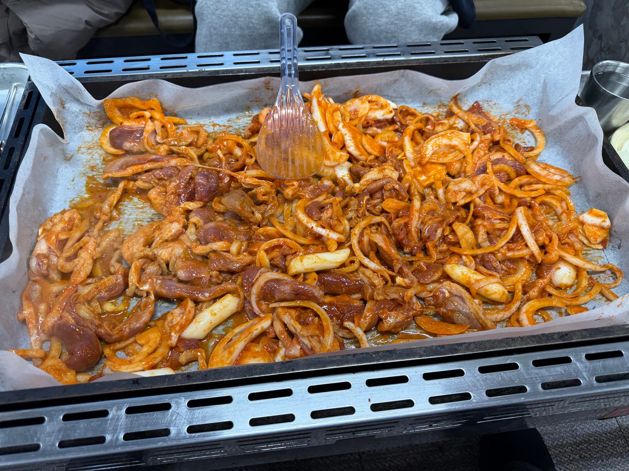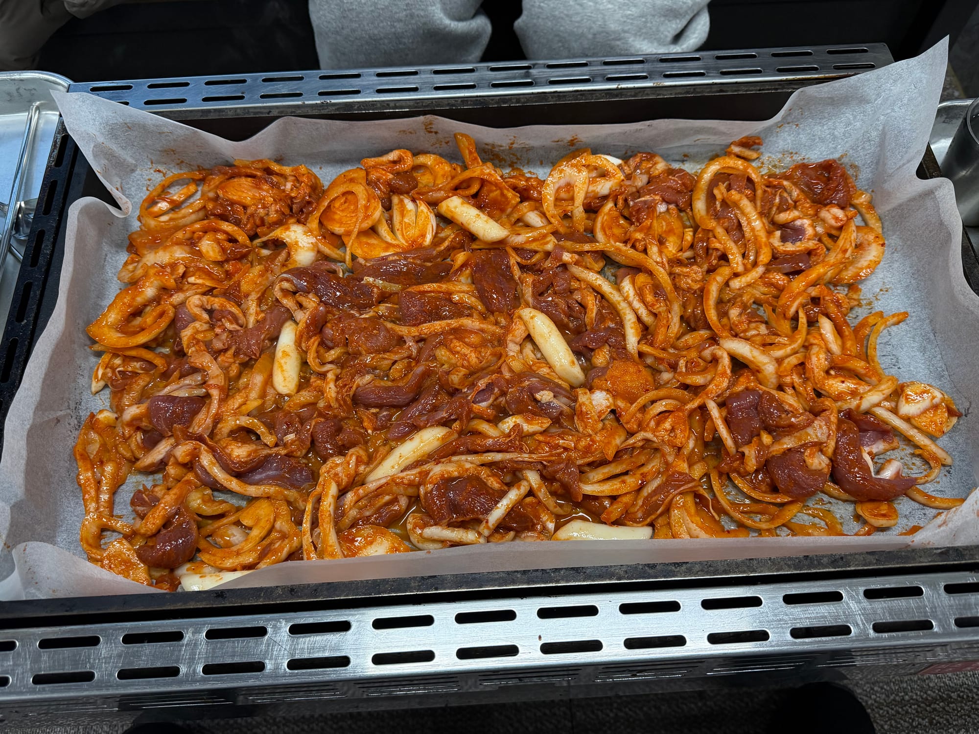 Preparing the iron grill with parchment paper and spreading the Ori-jumulleuk(오리주물럭) to cook.