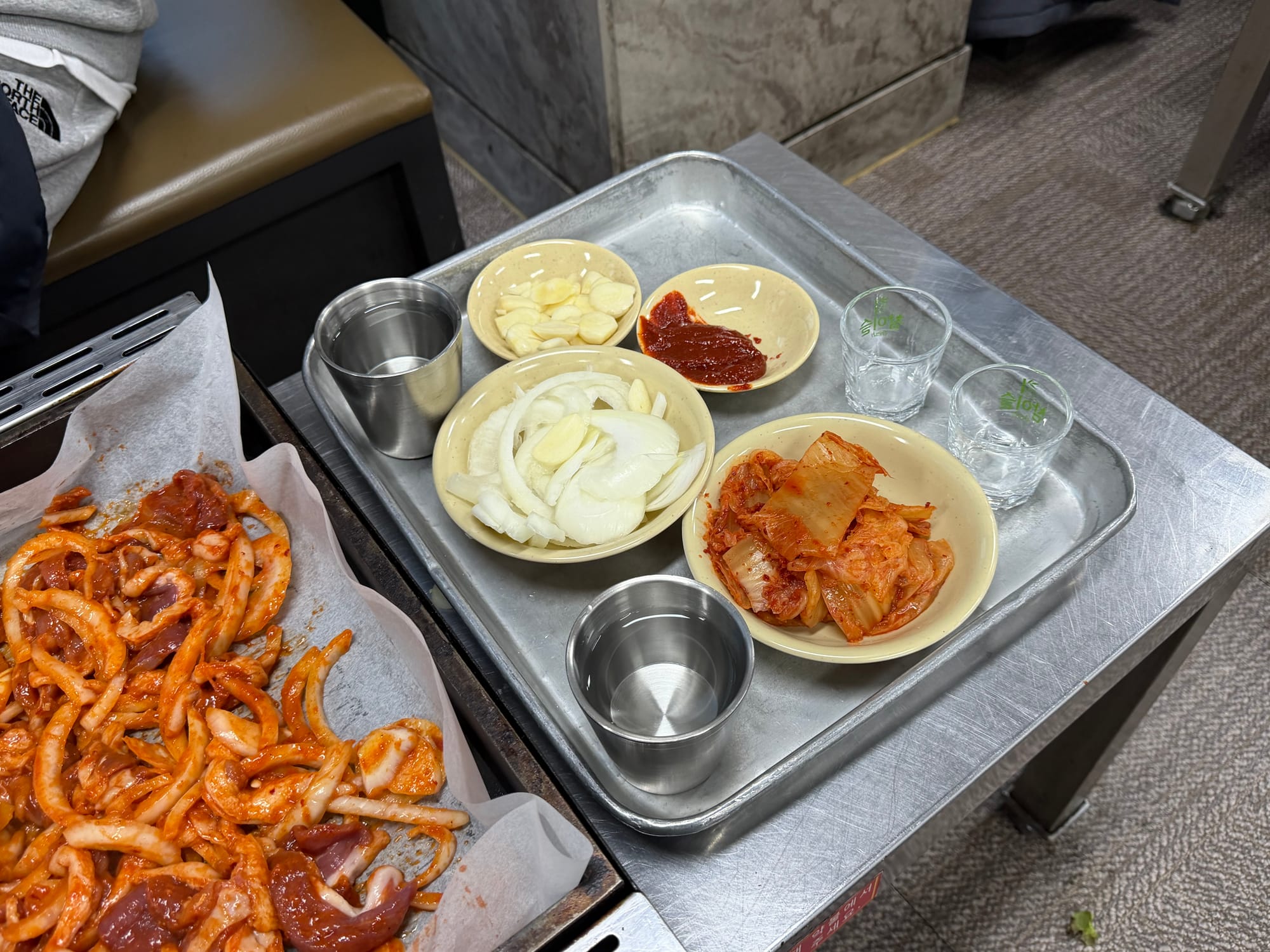 Basic side dishes like raw onions and Kimchi are available at the self-bar. The Kimchi is perfectly fermented and tastes excellent when paired with the duck. If you need more sauce or extra vegetables, you can easily refill them yourself. The simplicity of the side dishes allows the quality and flavor of the Ori-jumulleuk(오리주물럭) to truly shine.