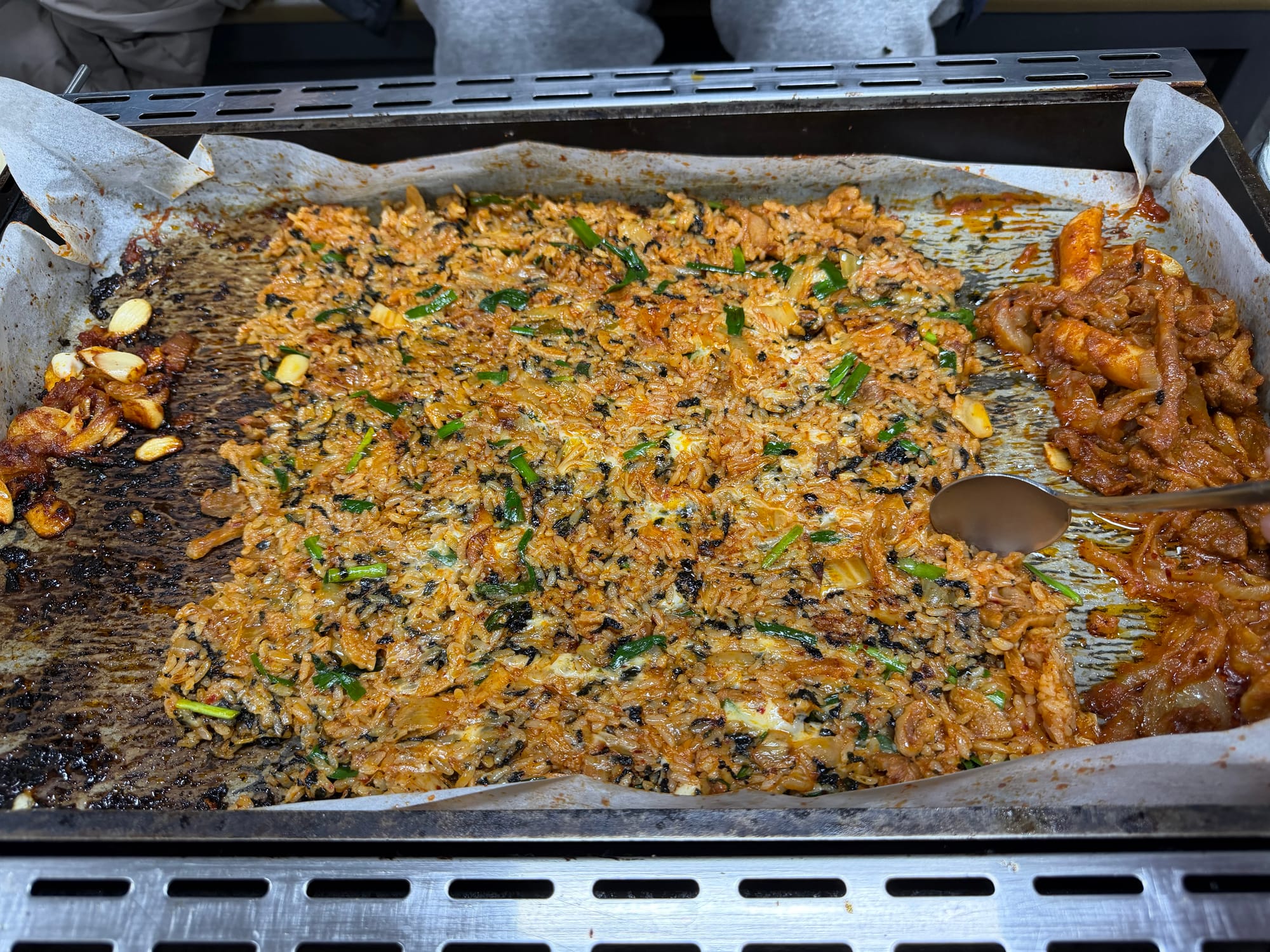 A video capturing the satisfying process of making Bokkumbap(볶음밥) on the iron grill.