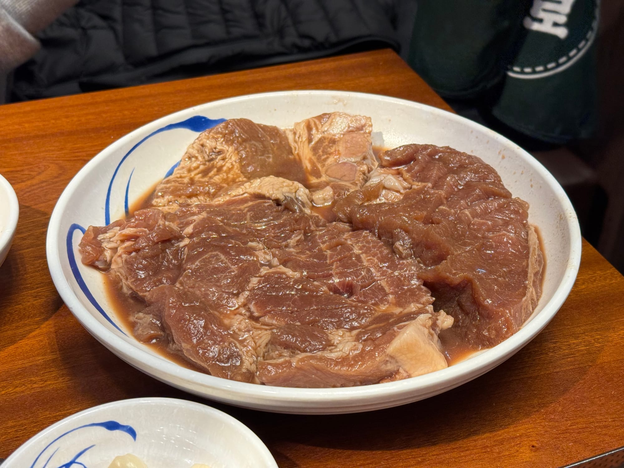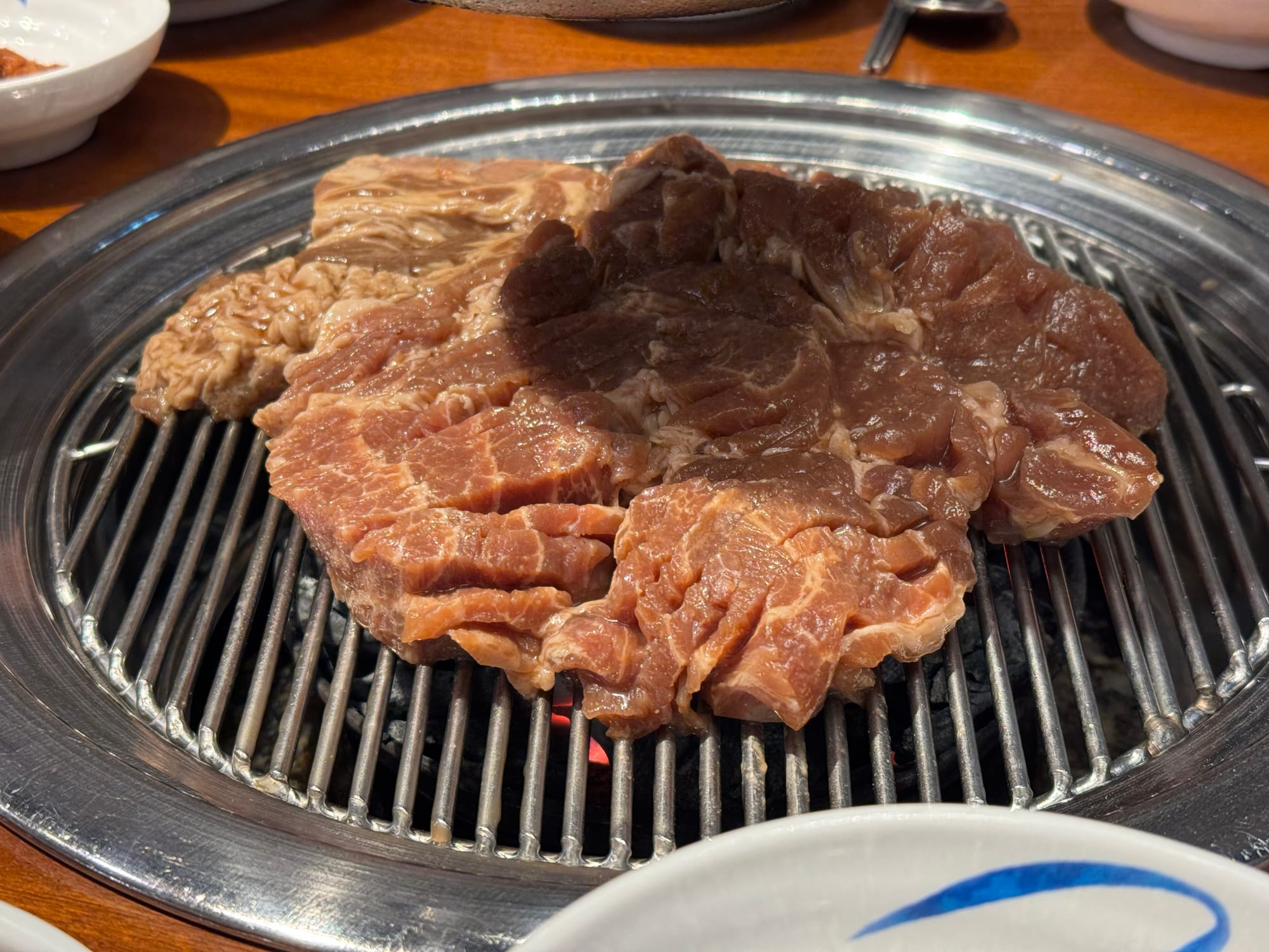 The raw Dwaeji-galbi(돼지갈비) appeared more like pork neck than the actual rib portion. This restaurant offers a service where the staff grills the meat for you. However, the grilling skill seemed a bit clumsy, as many pieces of meat fell out of the grill during the process.
