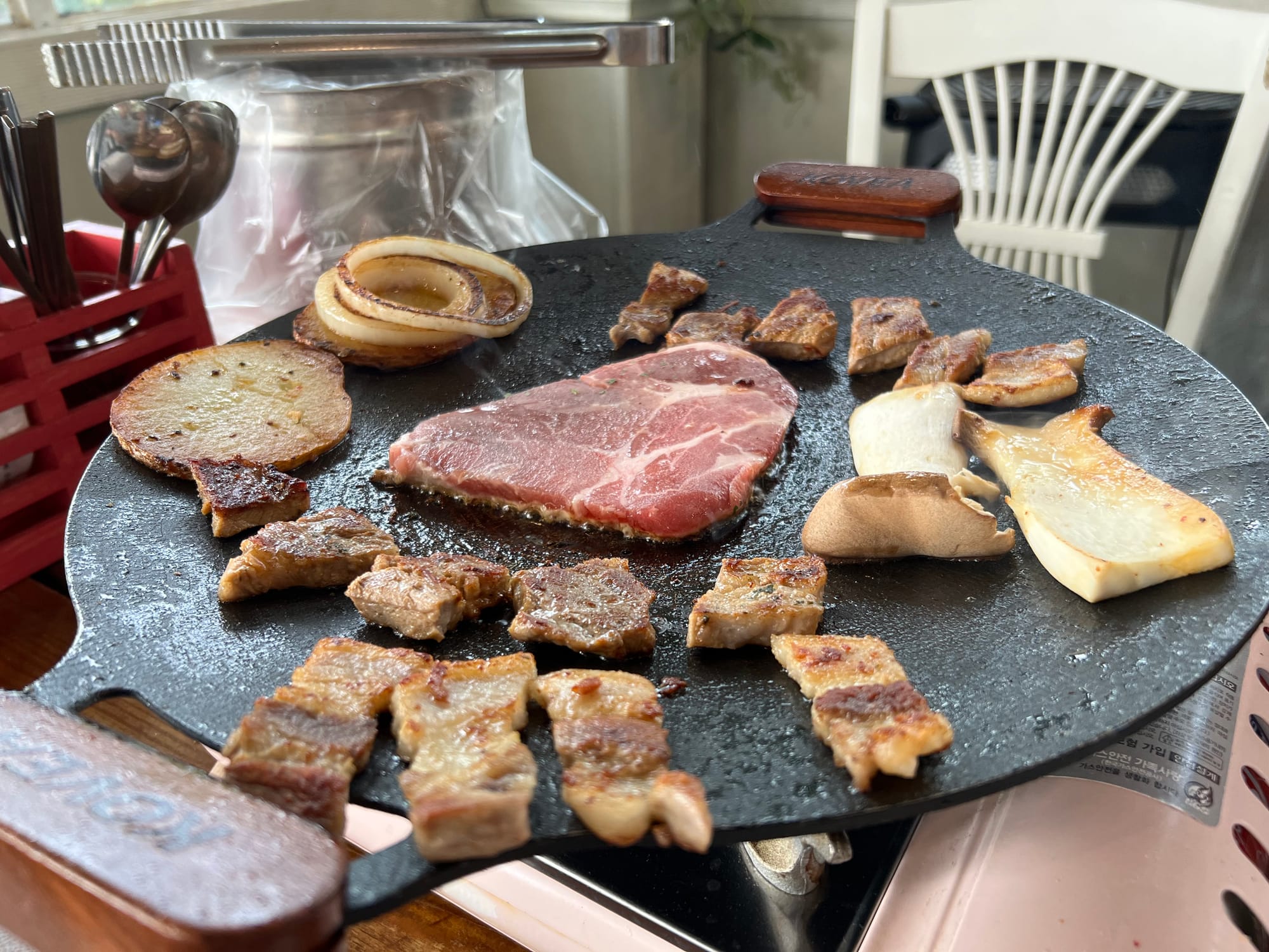 - Samgyeopsal(삼겹살): Korean style grilled pork belly.