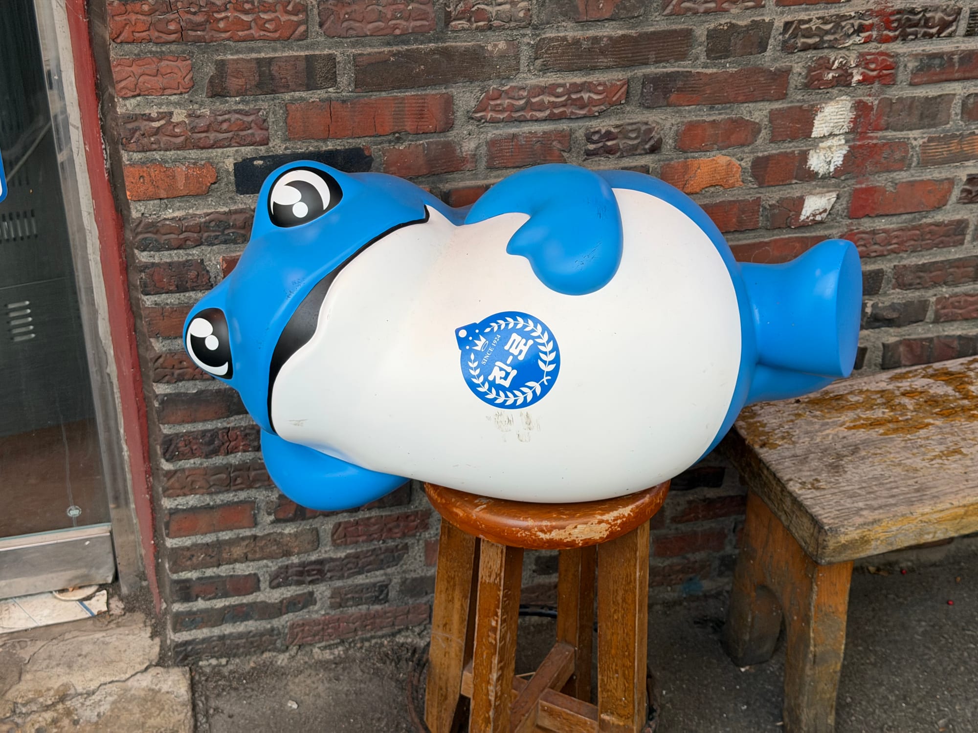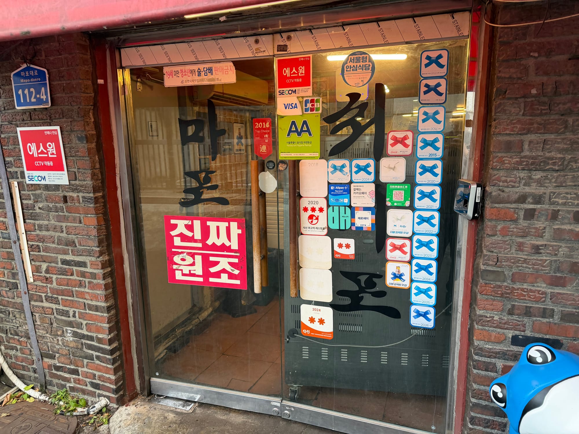At the entrance, a giant Jinro toad mascot lying down playfully greets every guest. Next to it, numerous Blue Ribbon Survey stickers are proudly displayed, serving as a testament to the restaurant's quality and reputation over the years.
