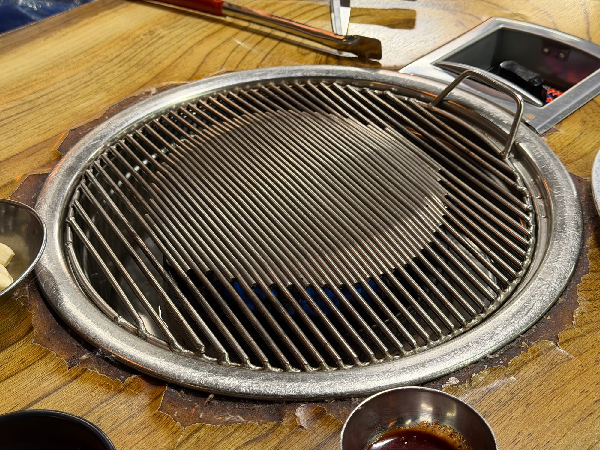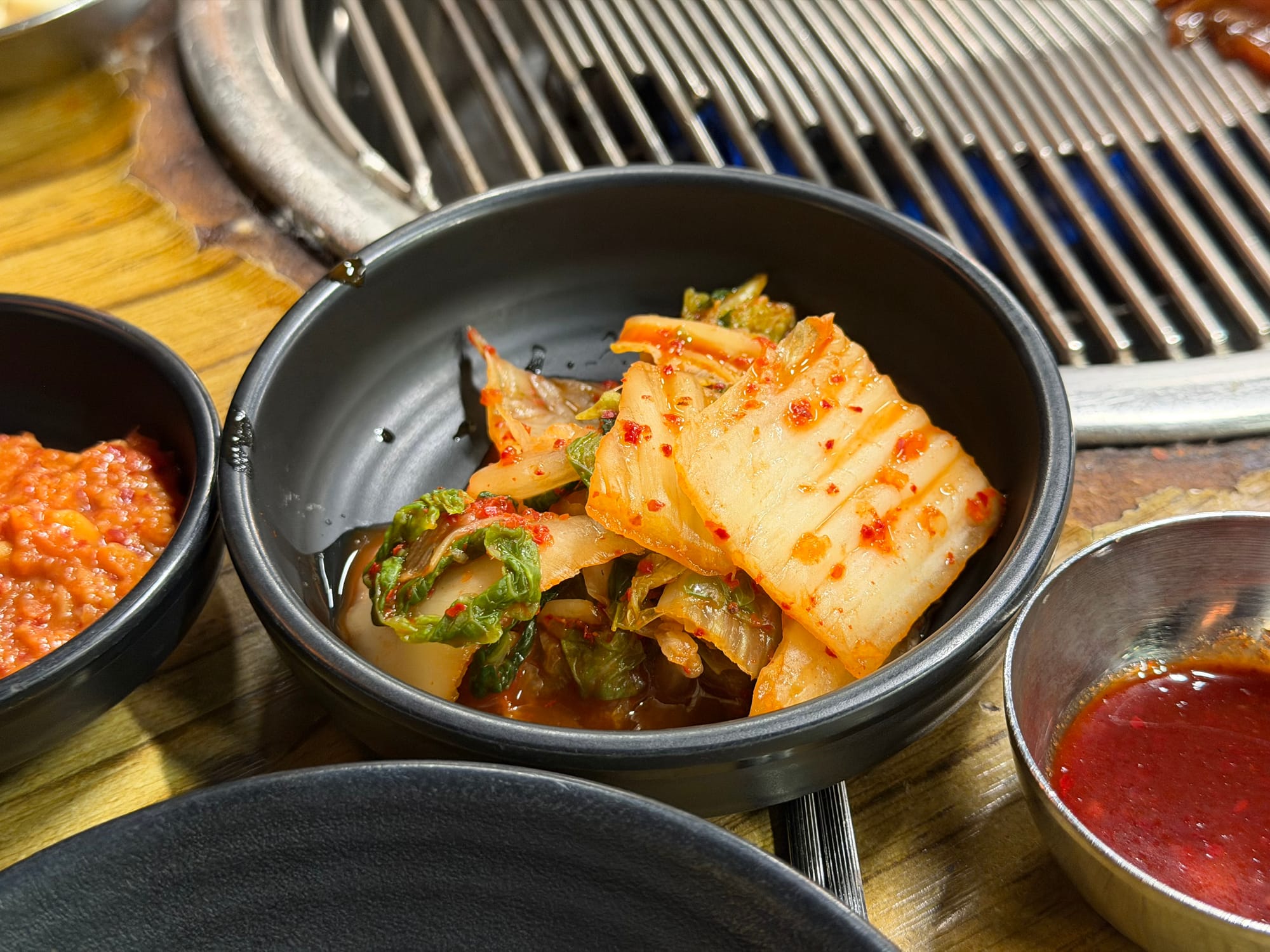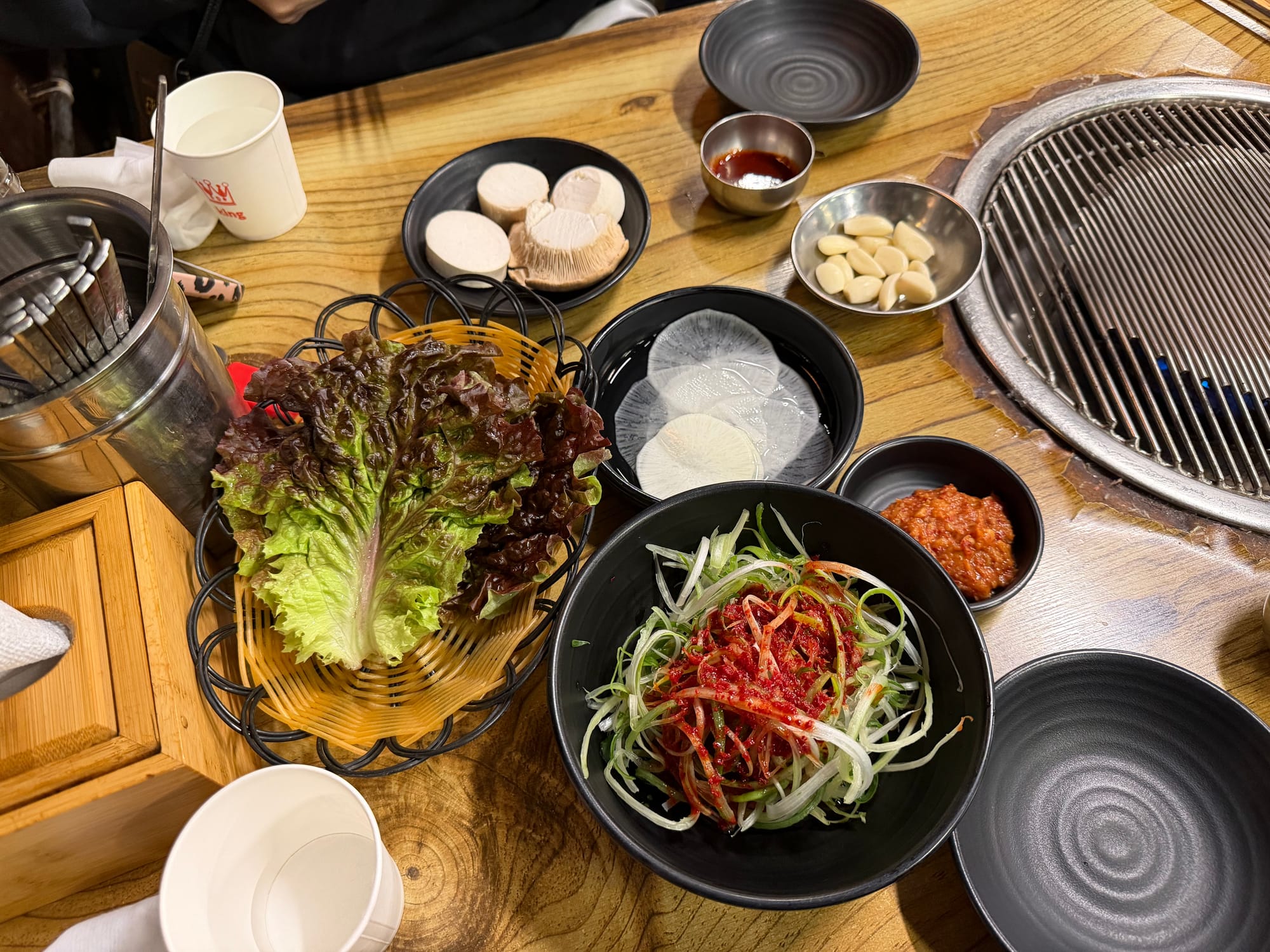 The table is promptly set with basic side dishes such as pickled radish, fresh lettuce, and seasoned Pachae(파채). The neatly served Kimchi(김치) and a sturdy grill stand ready, completing the preparation for the legendary ribs.