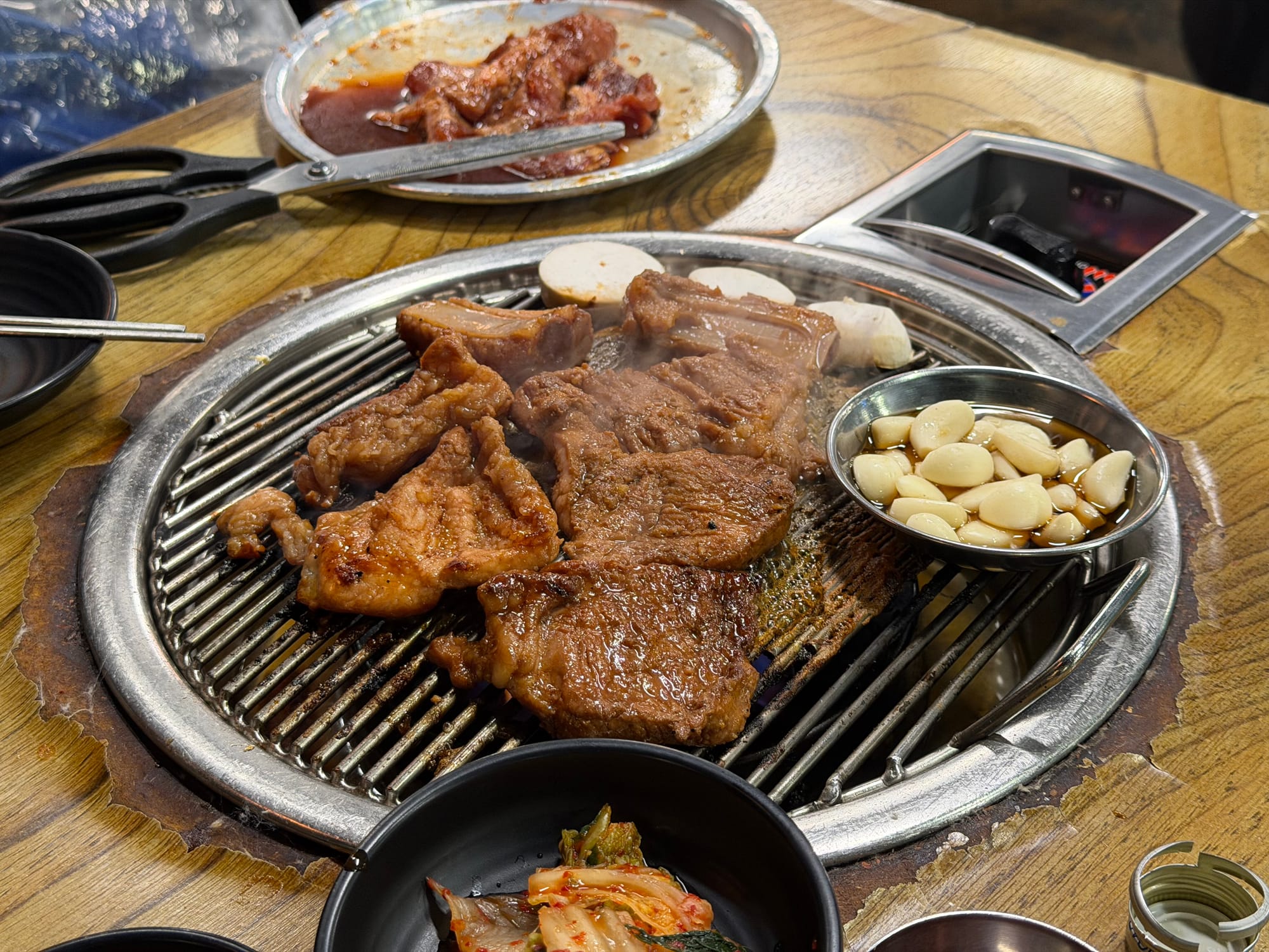 The highlight of the meal is the Dwaeji-galbi(돼지갈비), which is deeply infused with a rich marinade. As the meat hits the hot grill, the savory aroma fills the air. Adding mushrooms and garlic in oil to the grill creates the perfect harmony of flavors.