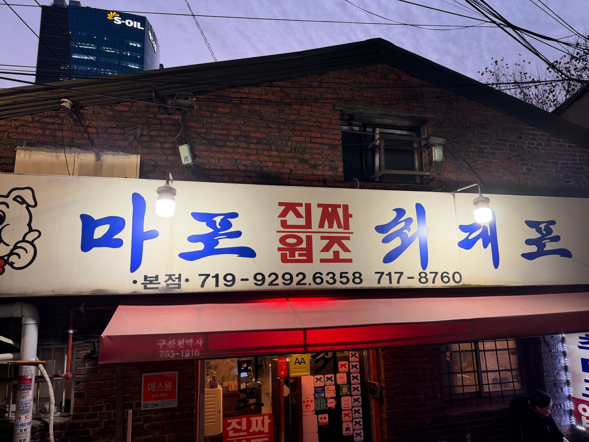 When night falls over Mapo(마포), the illuminated sign of Jin-jja-won-jo-choe-dae-po(진짜원조최대포) shines brightly, signaling its long-standing presence in the area. The restaurant’s exterior in the evening evokes a sense of nostalgia for old Seoul.