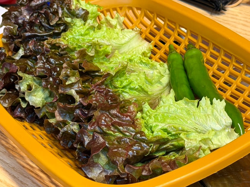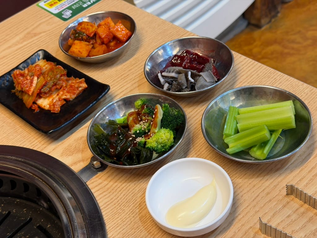 The side dishes arrived quickly. Along with fresh lettuce and peppers, they served Kimchi(김치, fermented vegetables), Broccoli-chojang(브로콜리초장, broccoli with sweet and spicy dipping sauce), and even Celery-mayonnaise(샐러리 마요네즈, celery with mayonnaise).