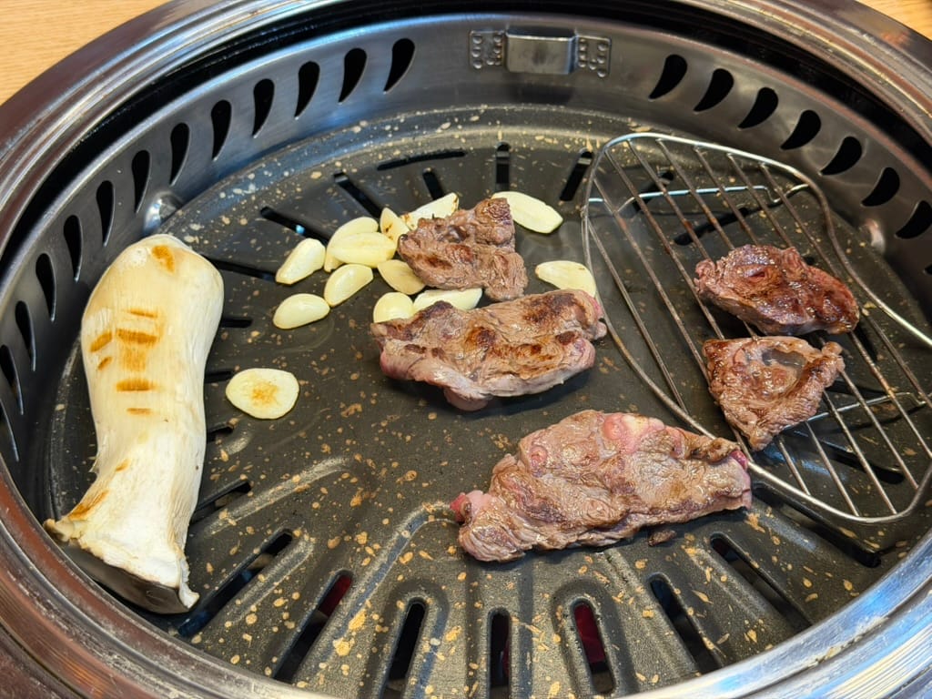 I grilled the Jebichuri(제비추리, lean beef) first with some garlic. The sound of the sizzle and the smell of the charcoal-grilled meat were incredible.