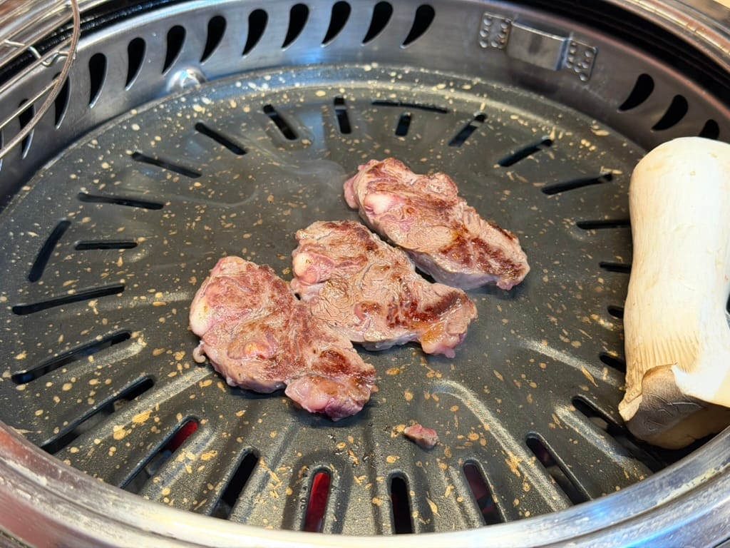 Now, for the main event. I started with Jebichuri(제비추리, lean beef) and Hangjeongsal(항정살, pork jowl) along with Saesongi-beoseot(새송이버섯, king oyster mushrooms).