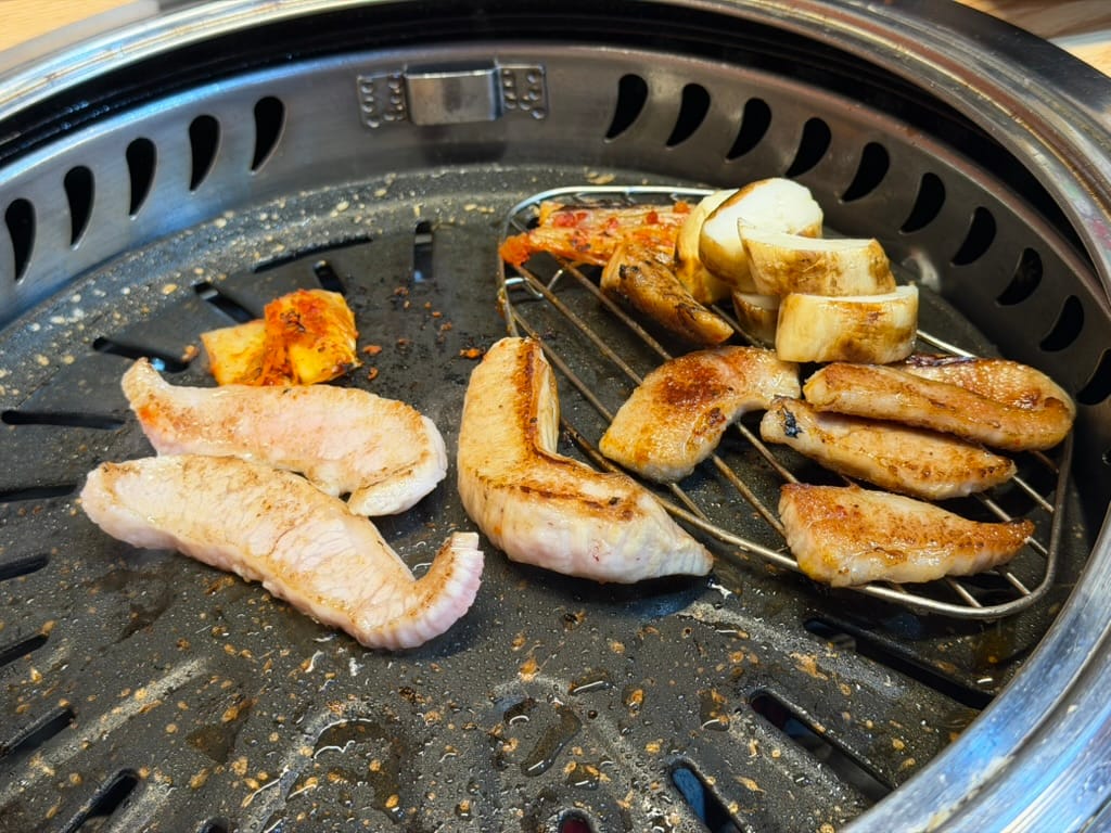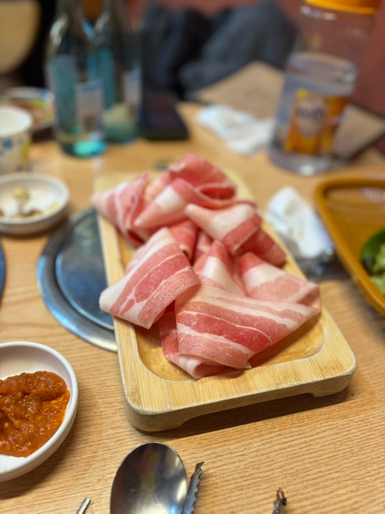 Next up was the Hangjeongsal(항정살, pork jowl). I still wanted a bit more, so I ordered Daepae-ogyeopsal(대패오겹살, thinly sliced five-layered pork belly). Its crispy texture was a great follow-up.