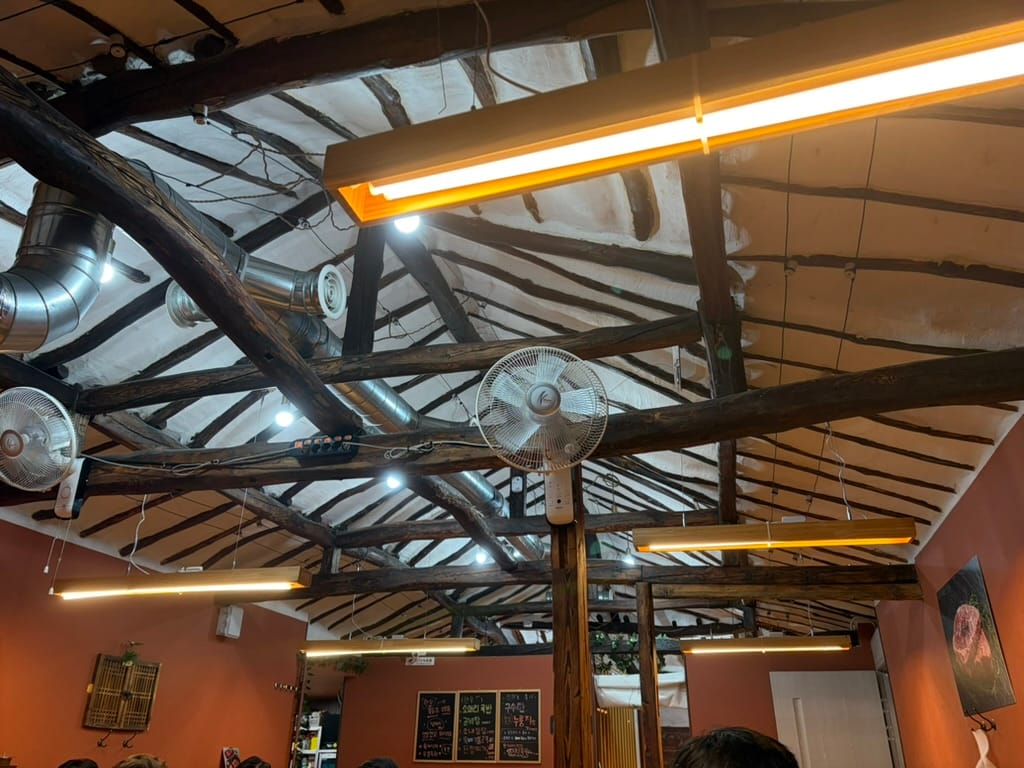 Last Saturday, I visited Hwanggane Jeong-yuk Sik-dang. What makes this place special is the atmosphere. It’s a remodeled old Hanok(한옥, traditional Korean house), and you can still see the beautiful wooden ceiling structures.