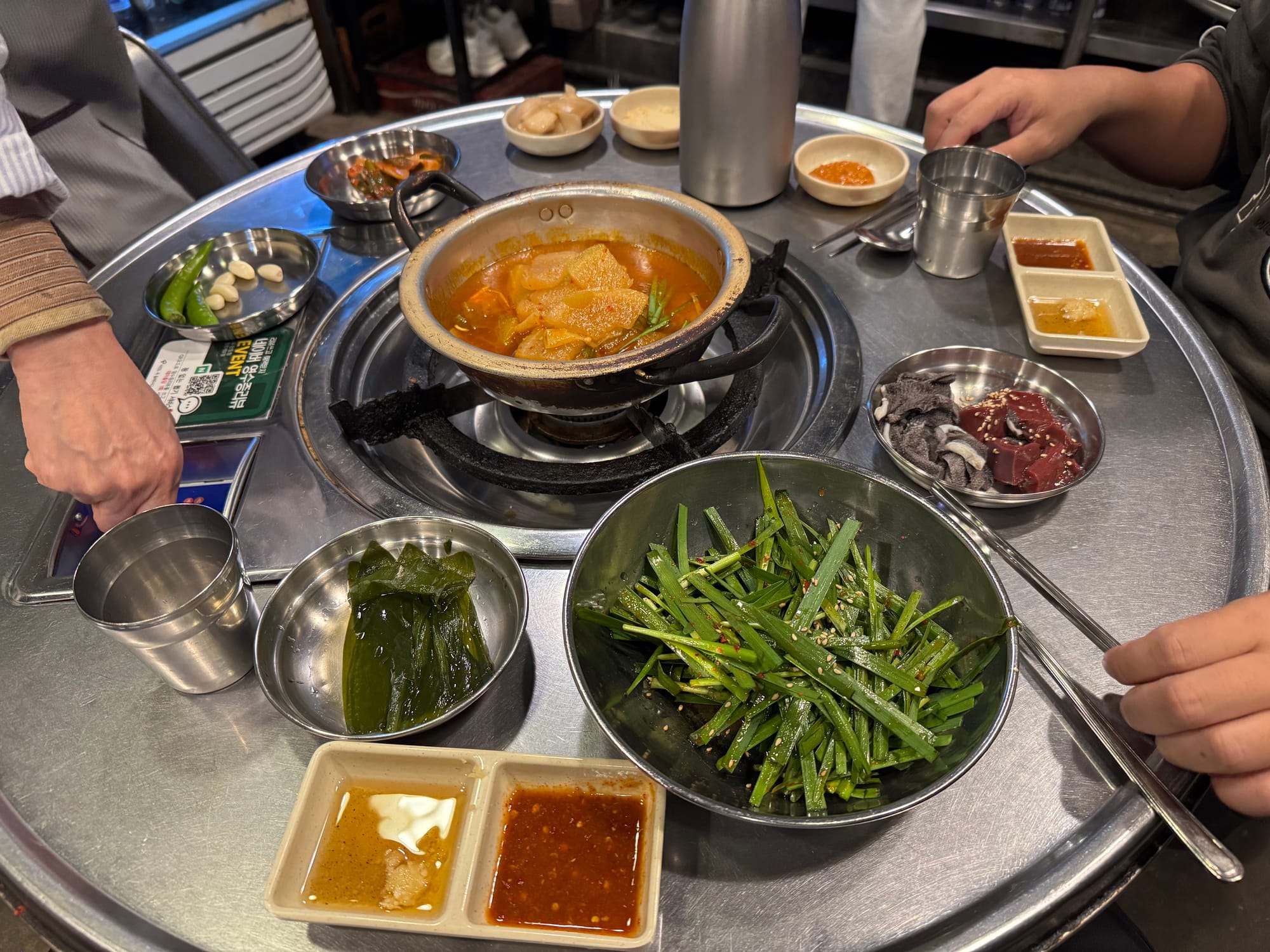 The basic table setting was surprisingly generous. It featured Buchu-muchim(부추무침), Myeongi-namul(명이나물), and fresh Gan(간) and Cheon-yeop(천엽). A unique start to the meal was the Ramyeon(라면) served in a pot, which had a refreshing flavor similar to Mu-guk(무국).
