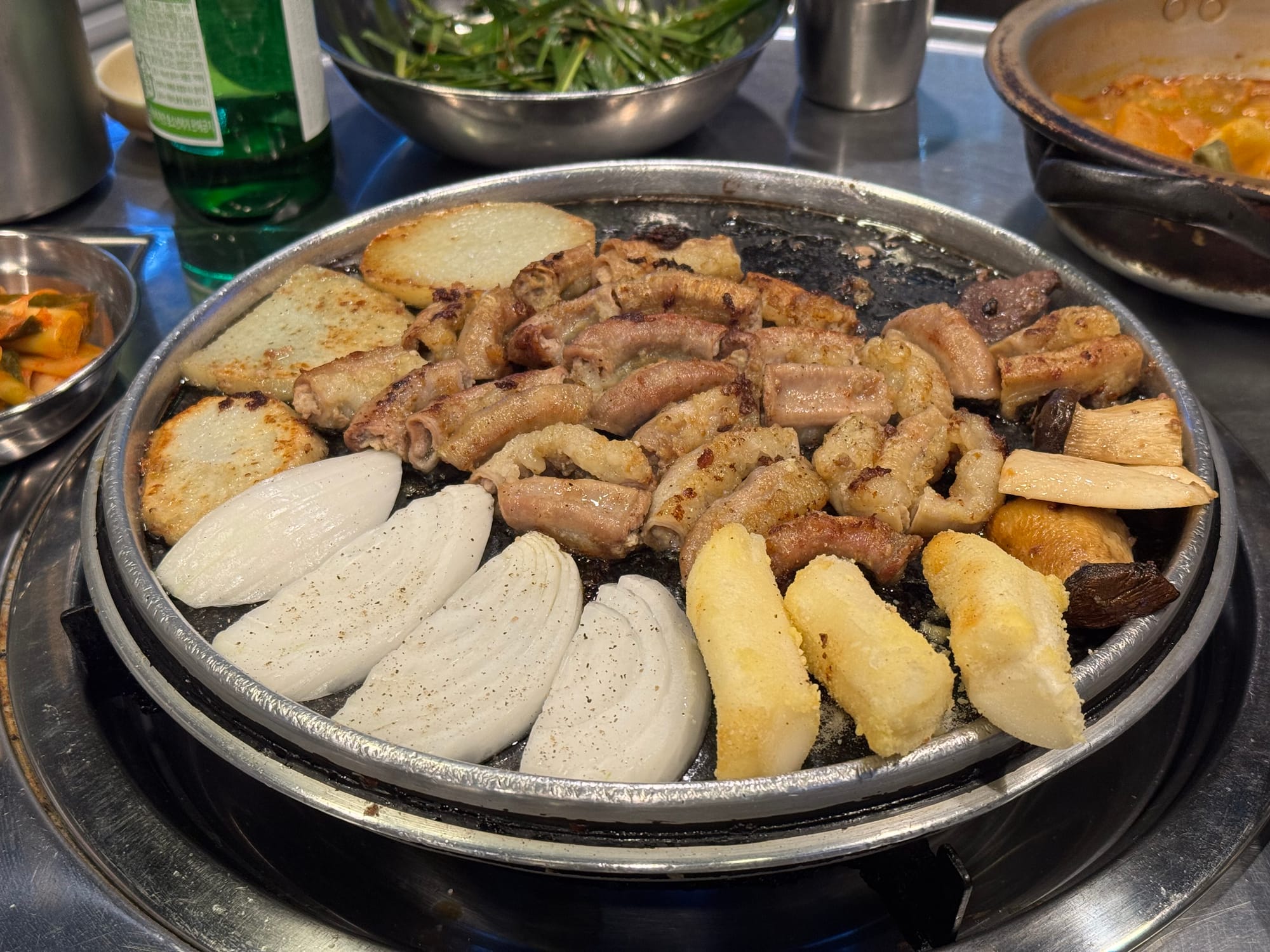 The main Sogopchang(소곱창) sizzled on the grill, accompanied by potatoes, onions, and Tteok(떡). The tripe was packed with richness, and the fatty flavor combined with the savory aroma created a perfect harmony with the long conversation.