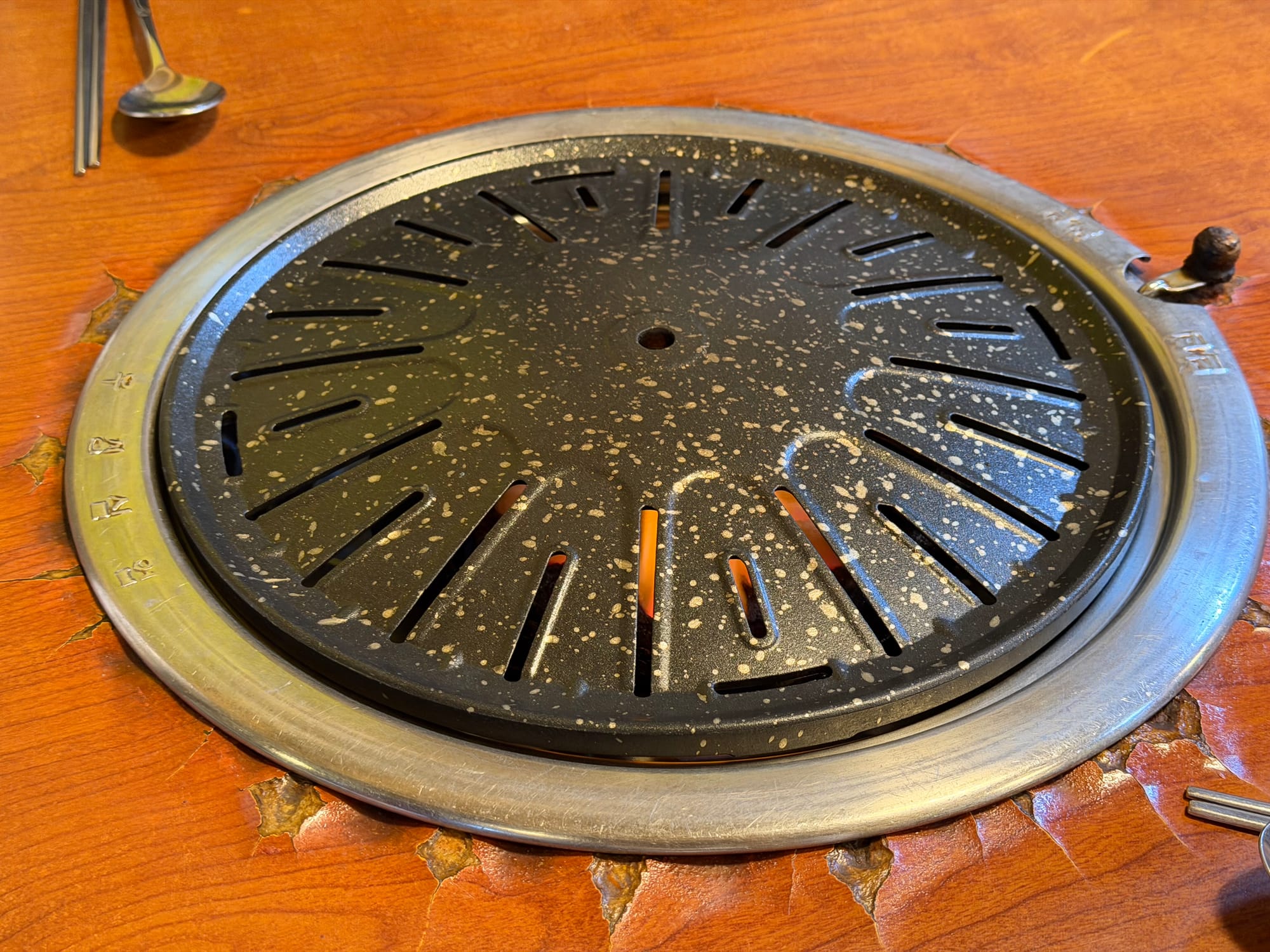 I ordered one serving of So-makchang(소막창, beef abomasum) and one serving of Samgyeopsal(삼겹살, pork belly). The clean, empty grill was ready for the feast.